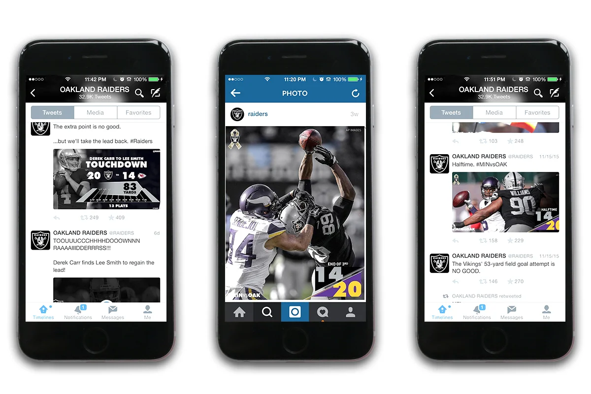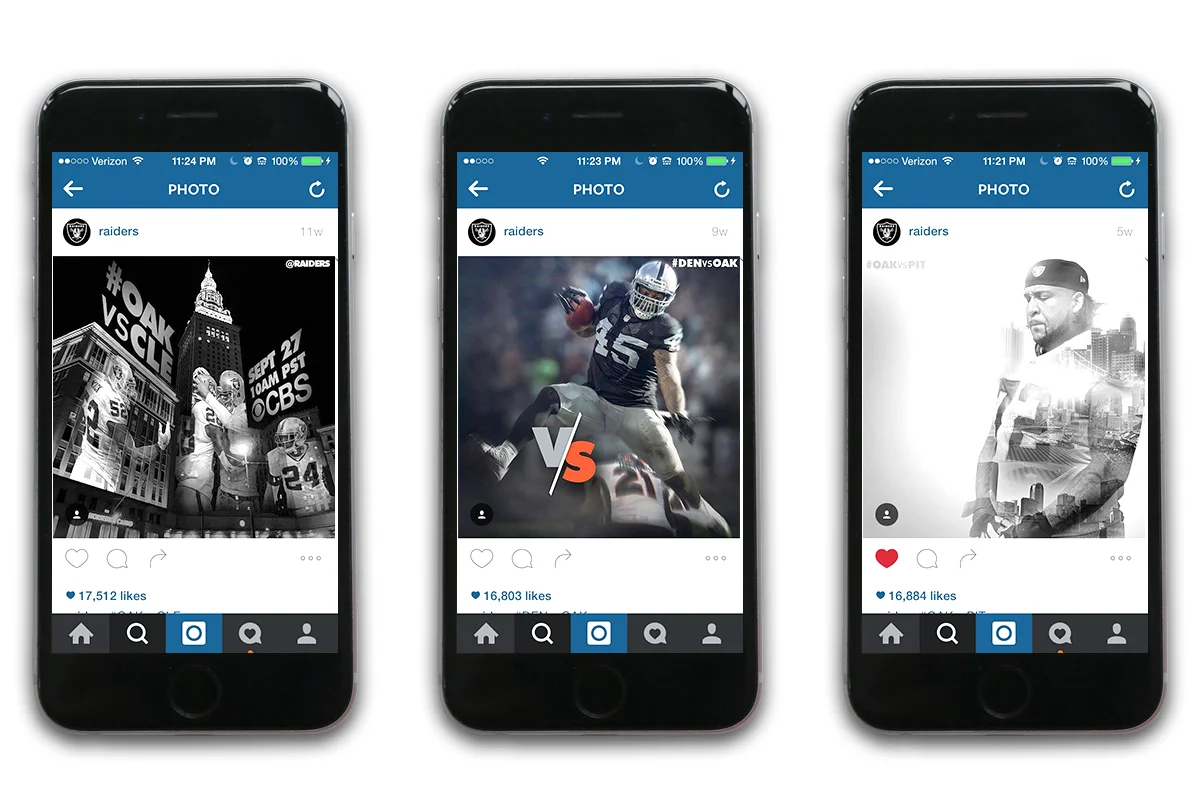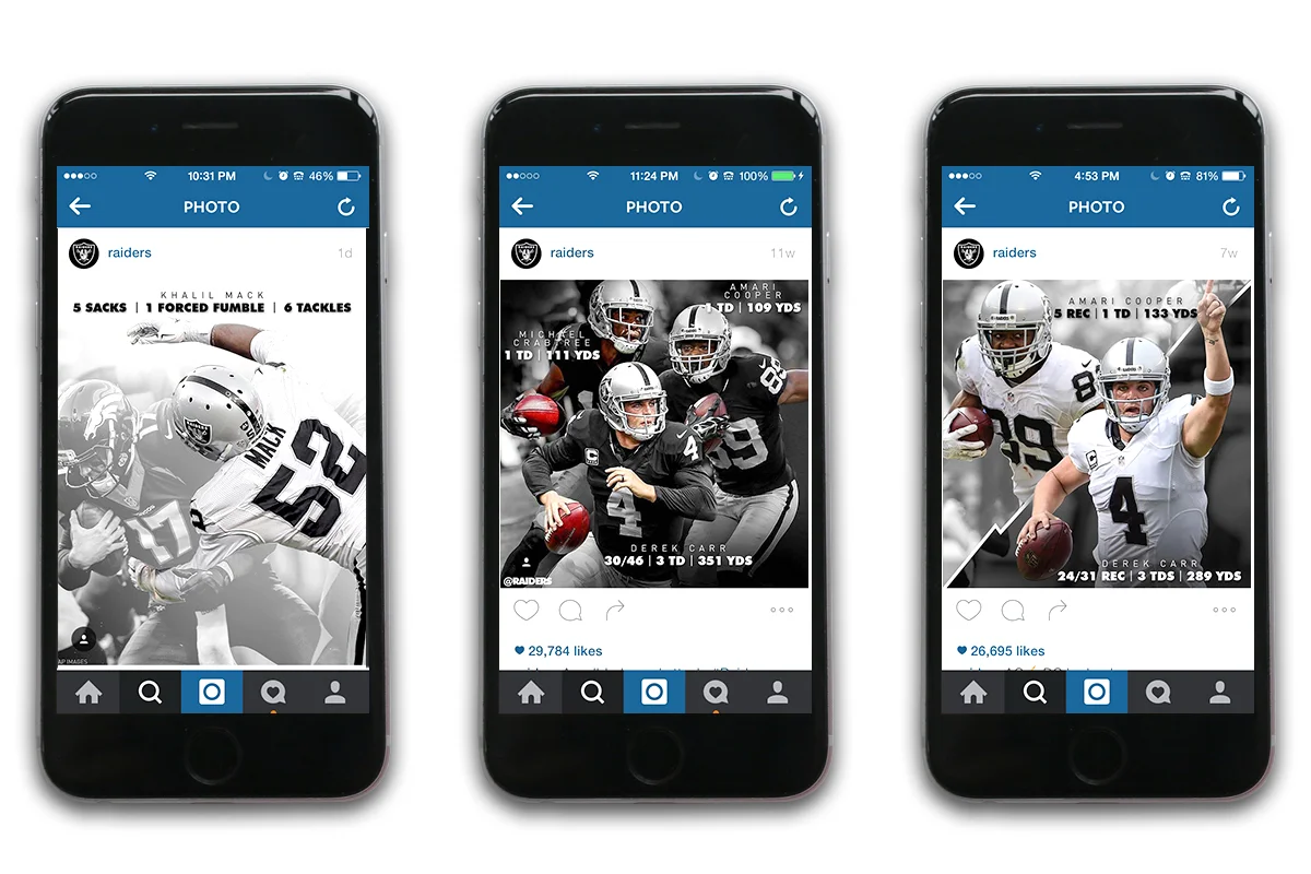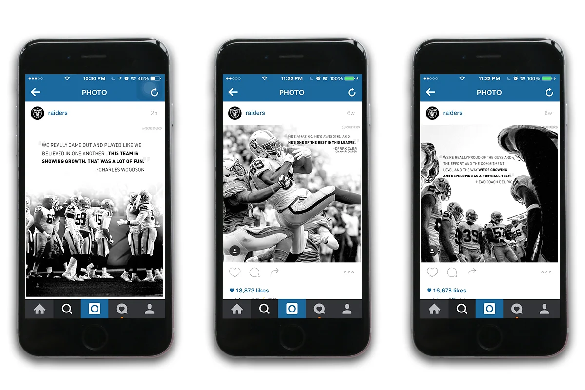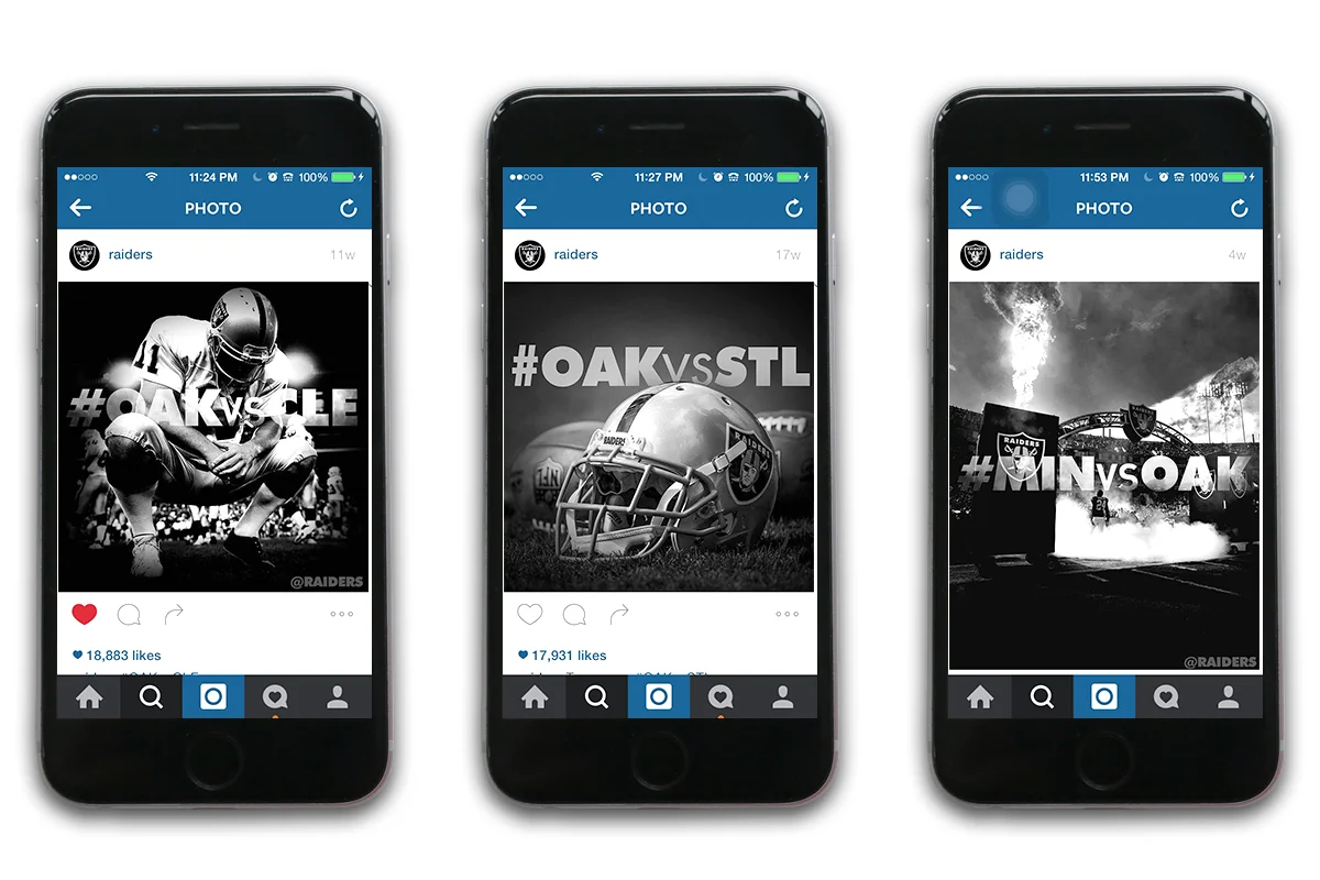 Previously, the approach was a little scattershot — a "let's design some cool things when we have time" mindset but that led to less than ideal consistency in the look of graphics, the volume of them that were being posted on platforms each week (for example, after losses compared to wins), and the messages/themes behind them. But ahead of the 2015 season I proposed a concrete plan for a series of graphics based on the team's practice and game schedule, and collaborated with our excellent Creative Services team — much love, respect, and appreciation to Caitlin Wienck, Aaron Ward, and Esteban Carbajal, who were all instrumental in making this come to life — to come up with a look and feel that really exemplified the Raiders brand.